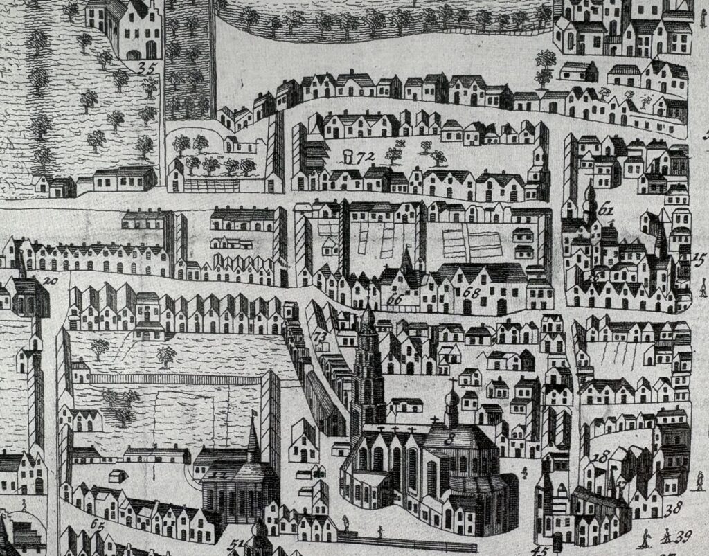 Op de plaats waar nu het Willibordushuis is gevestigd, stond vijfhonderd jaar geleden een groot huis met dikke muren, stevige kelders, een trapgevel en een hoog torentje. Op de hier afgebeelde kaart uit 1570 zien we Huis te Baertwijck bij nummer 61. Het terrein liep vanaf de oostkant van de Oude Molstraat (in die tijd Gasthuisstraat geheten) tot aan het Noordeinde, alwaar een stal stond (nu ons proeflokaal).